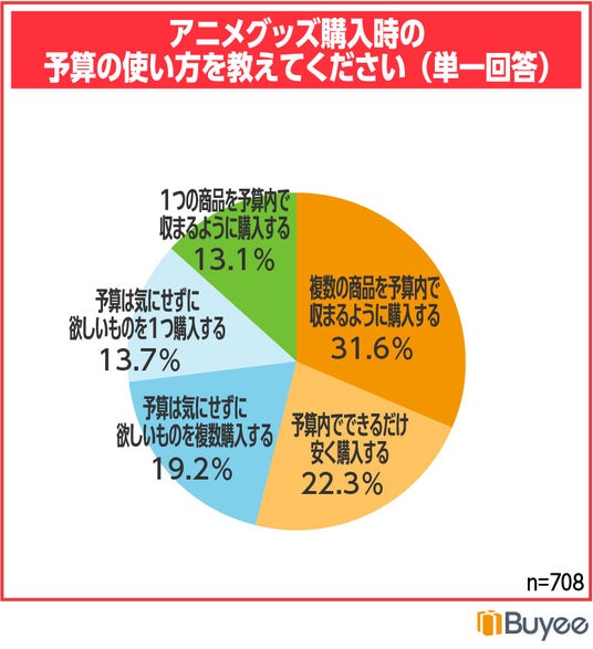 アニメグッズを購入する際の1回あたりの予算をきいたところ、最も多い回答は「5000円以上1万円未満」で25.1%となりました。「1万円以上2万円未満」が23.0%と続くため、1万円前後に需要のボリュームがあると考えられます。また、予算の使い方について聞いたところ「複数の商品を予算内で購入する」とした割合が31.6%と最も多い一方で、「予算は気にせず欲しいものを複数購入する」19.2%、「予算は気にせずに欲しいものを1つ購入する」13.7%となっており、合算すると「予算を気にせず購入する」層が32.9%存在しています 。アニメグッズは趣味的消費をされる傾向が強いため、仮に限定品などの理由で予算よりも高額であっても購入意向が伺える結果となりました。