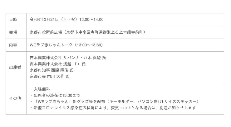 エキサイト株式会社(所在地:東京都港区、代表取締役社長:西條晋一、以下「エキサイト」)運営のママ向けウェブメディア「ウーマンエキサイト」が立ち上げた「WEラブ赤ちゃんプロジェクト」は、京都府を含む52団体の官民からなる「京都府子育て環境日本一推進会議」(会長:京都府知事 西脇隆俊)とともに、「WEラブ赤ちゃんプロジェクト」重点キャンペーン第二弾を実施することをお知らせします。