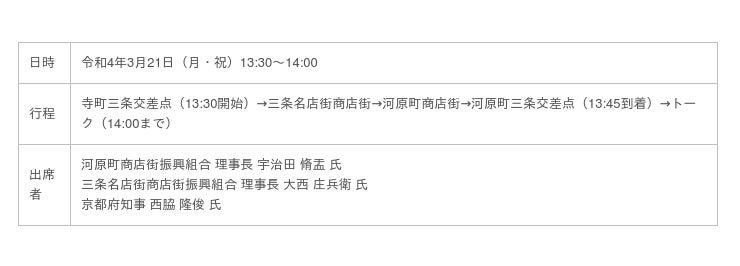 「泣いてもかましまへん!」フラッグ等が一斉掲出された河原町一帯の商店街を、西脇知事と商店街関係者が徒歩視察します(終着地で、商店街関係者への取材が可能です)。
