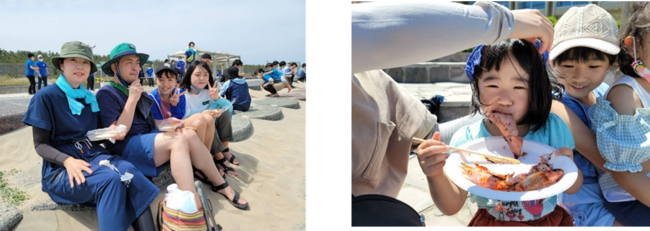 清掃活動を終えビーチをキレイにした後は、とっとり実行委員会では初めての試みとなる「浜焼き」を振舞いました(先着100人分)。今回の食材提供・調理にあたっては、地元の鮮魚店や旅館にご協力をいただきました。このうち西部会場では、太田准教授の話にもあった鳥取県産の「ハタハタの丸干し」や、山陰沖で漁獲されたスルメイカ、アナゴなどが振舞われ、参加者は地元の海の恵みを味わいました。「こうした海の幸を味わえるのも、きれいな海があってこそ!」と、参加者はその思いを改めて実感しているようでした。