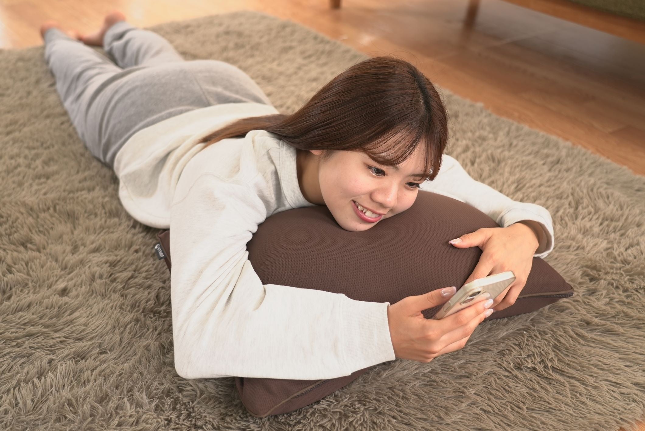 仰向けや横向きはもちろん、抱え込めるミニサイズなので、床やデスクでうつ伏せになって使用したりクッションのように背もたれにしたりしてご活用いただけます。