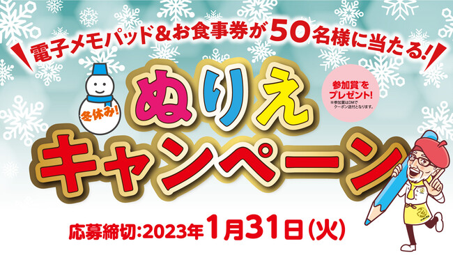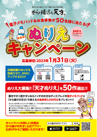 揚げたてから揚げとテリー伊藤こだわりの玉子焼き「から揚げの天才」は、、2022年12月17日(土)~2023年1月31日(火)まで、小学生以下限定の「冬休みぬりえキャンペーン」を実施しています。「から揚げの天才」の店頭に置いてある専用用紙に色を塗ってご応募できます。応募方法は、「#から揚げの天才ぬりえ」「#から揚げの天才」をつけて公式Twitter、Instagramにぬりえを投稿することで参加できます。選出された50名様には電子メモパッド&お食事券2,000円分(500円×4枚)をプレゼントします。※参加賞もご用意しております。キャンペーンの詳しい内容は、「から揚げの天才」公式ホームページ、公式アプリからご確認頂けます。ぜひ、皆様のご応募お待ちしております。