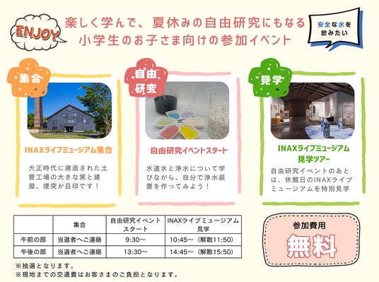 株式会社LIXIL(以下LIXIL)は、INAXライブミュージアム(愛知県常滑市)にて、水について楽しく学べる夏休み自由研究イベント「水道水と浄水について学ぼう!」を2025年7月30日(水)に開催します。小学3年生~6年生を対象としたイベントで、水道水や浄水の仕組みを学んだり、PETボトルを用いた簡単な浄水装置を作って実験したりと、夏休みの自由研究のヒントになる体験が満載!自由研究イベント後には、INAXライブミュージアムを貸切でご見学いただけます。リクシルオーナーズクラブに会員登録することで、親子やご兄弟など、1組2~3名までご参加いただける無料イベントです。応募受付は6月6日(金)まで。奮ってご応募ください。