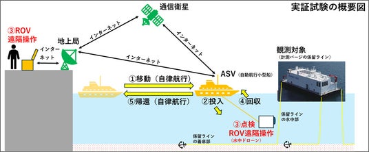 水中を自律探査するAUVの社会実装に向けた最初のステップとして、今回はASVとROVを用いて、将来のAUV化を想定した実証試験を海上で行います。本実証試験では、浮体式洋上風力発電設備に見立てた観測対象(注5)の水中データを無人で取得する技術の有効性を確認します。