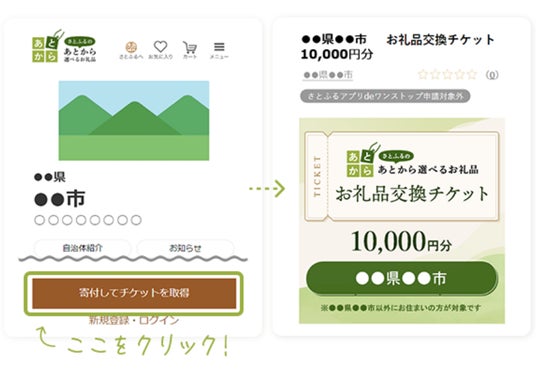 「さとふるのあとから選べるお礼品」は、対象の自治体に寄付すると受け取ることができる「お礼品交換チケット」を、寄付した自治体が対象としているお礼品に交換できるサービスです。