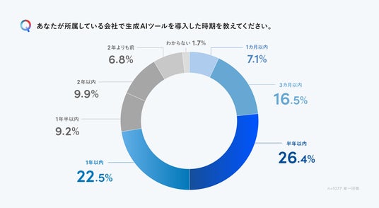 自社で生成AIツールを導入した時期について、「半年以内」が26.4%で最多となり、次いで22.5%が「1年以内」、16.5%が「3カ月以内」、7.1%が「1カ月以内」と回答。合わせて72.5%が1年以内に導入しており、2025年から急速にビジネスにおけるAI活用が進んだことがわかりました。