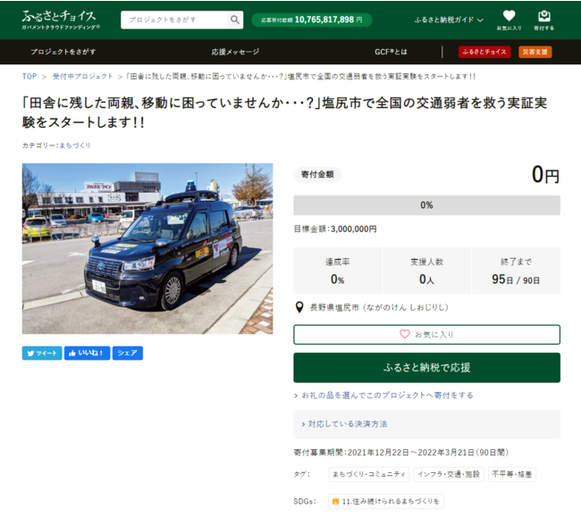 長野県塩尻市とふるさと納税総合サイト「ふるさとチョイス」を企画・運営する株式会社トラストバンク(本社:東京都渋谷区、代表取締役:川村憲一、以下「トラストバンク」)は本日12月22日、トラストバンクが提供するクラウドファンディング型でふるさと納税を募る仕組み「ガバメントクラウドファンディング(R)」(以下GCF)で、全国の交通弱者を救う実証実験を目的としたプロジェクトを開始します。募集期間は2021年12月22日(水)~3月21日(月)、目標寄付金額は300万円です。