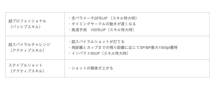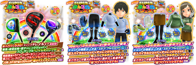 今回の「SUPERみんゴルフェス」には、「S-ring」シリーズから、ギアガチャには最大パワーが530に加え、新スキル「レイルチャレンジ」、「レイルパワーショット」、「新ジャストチャンス3」を搭載した新ギア「スリングPレイルギア」が登場いたします。ウェアガチャにもインパクト時に効果的なスキルを複数搭載した新作ウェアが登場!さらに「10回プレイ」2・4・6・8セット目で新作ウェアが確定となります!ぜひ、ご参加ください。