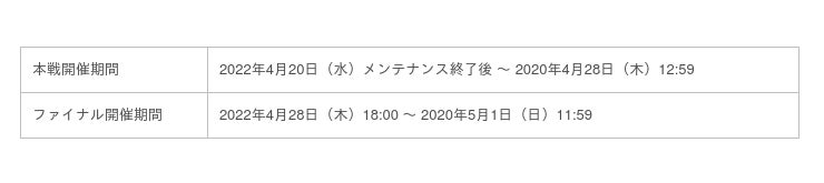 開催期間:2022年4月20日(水)メンテナンス終了後~2021年5月1日(日)11:59