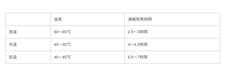 発熱温度:低温 40~45℃(6.5~7時間)、中温 45~55℃(4~4.5時間)、高温 60~65℃(2.5~3時間)