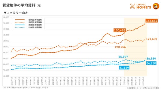 2025年12月の賃貸物件の掲載賃料は、首都圏シングル向きで88,294円(前年同月比+24.8%)、ファミリー向きで148,682円(同+14.0%)、近畿圏シングル向きで62,167円(同+7.5%)、ファミリー向きで86,230円(同+6.3%)となり、いずれも2020年の計測開始以降の最高値を更新しました。