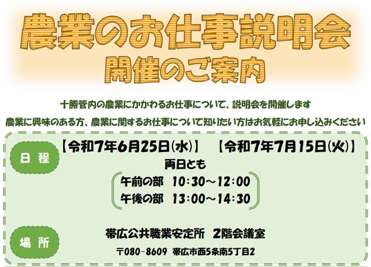 このことから、十勝総合振興局では、農業現場における労働力不足の解消に向けて、管内市町村や農業団体などと協力し、社会人や異業種からの転職希望者などを対象とした「農業のお仕事説明会」を開催します。