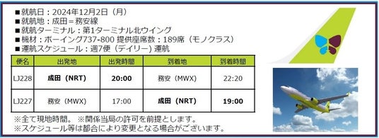 ジンエアー(IATAコード:LJ)は、2024年12月2日(月)より、定期旅客便として成田=務安線に就航します。韓国を代表するLCCである同社の成田路線は3都市に拡大します。