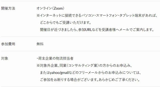 本セミナーでは受講者の皆様が知りたいことを事前アンケートで受付を行い、コンサルタントが質問にお答えしながら物流担当者として対策すべきポイント、知っておくべきことは何かを解説します。