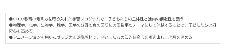 ヒューマンアカデミーではこれらを鑑み、STEM 教育の考え方を取り入れた学習プログラム「サイエンスゲーツ~かがくのもん~」を新たに開講することにいたしました。幼少期から科学分野に「体験」という形で触れることで、科学分野への興味関心や意欲を早期から育むことを目指します。