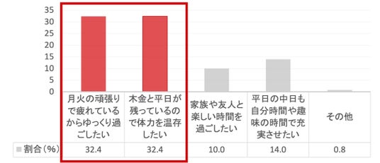 ・全体の32.4%が「水曜日に期待すること」に対し、「月火の頑張りで疲れているからゆっくり過ごしたい」「木金と平日が残っているので体力を温存したい」と回答
