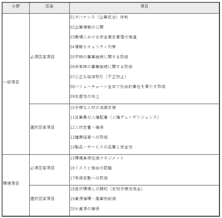 東証プライム上場企業に適用される情報開示基準などの要素を反映し、SDGsの経済・社会に相当する「一般項目」と環境に相当する「環境項目」の二分野で構成する審査項目を設定する。
