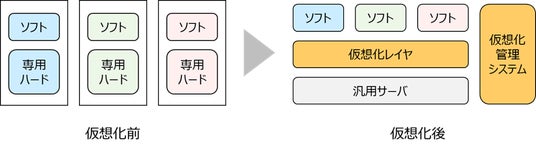 レイヤ(ハイパーバイザやコンテナ仮想化)を導入し、ソフトウェアとして動作させることです。完