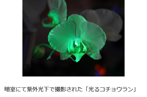 目に見えない紫外光(ブラックライト)をこの遺伝子組み換えコチョウランに当てると、花を含む植物体全体が黄緑色の強い蛍光を発し、暗がりでも鮮やかな「光る花」を鑑賞することができます。