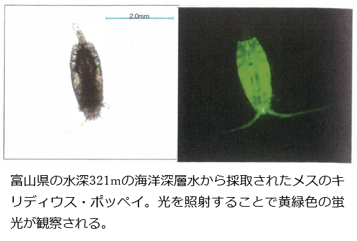 千葉大学は、これまでにも遺伝子組み換えによる青色コチョウラン(参考文献1)や青色ダリア(参考文献2)などの開発に成功してきました。「光るコチョウラン」の開発においては、NECソリューションイノベータ株式会社が海洋プランクトンの一種であるキリディウス・ポッペイ(図2)から単離に成功した蛍光タンパク質の遺伝子を改良し、奈良先端大学が開発したベクター(遺伝子の運び屋)に組み込みました。そのベクターを千葉大学が用いて、白花のコチョウラン品種をターゲットに遺伝子組み換えを行いました。