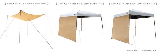 日差しをやわらげ風通し抜群で、まるで木かげにいるような快適さを実現する「木かげメッシュ スクエアタープ(360×360cm)」と「木かげメッシュ Qセットタープ用サイドウォール」2サイズを、アウトドアライフでぜひともご活用ください。