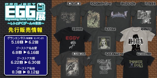 これら懐かしのレトロPCゲームの新作Tシャツは、2024年5月18日(土)~グランエンタス(秋葉原)会場を皮切りに開催される〈プロジェクトEGG展disk1 ~レトロPCゲームの世界~〉全国4会場にて先行販売が決定。