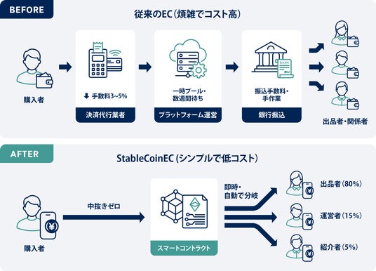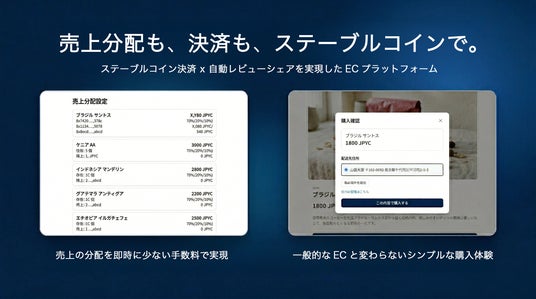本ソリューションは、スマートコントラクトによる直接決済の実装により、従来のEC運営において不可欠であった「決済代行業者」を介さない仕組みを構築。シリーズBラウンドでの17.8億円の資金調達を経て「社会実装フェーズ」に突入したJPYC( https://jpyc.co.jp )のエコシステムと連携し、劇的な手数料削減と、運営側の資金管理リスクを排除した新しい決済・分配体験を提供します。