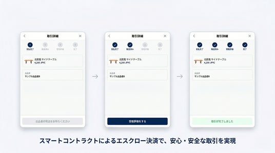 自動化された受金体験: 「発送→受取評価」のプロセスと連動してスマートコントラクトが自動でロックを解除し、販売者へ送金。不透明性のない、クリーンな決済体験を実現します。