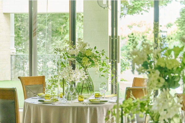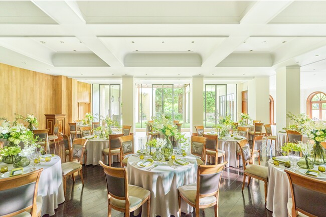 4日間限定の食事会場となる「ベネツィア」邸は、“森の中の一軒家”がコンセプトの披露宴会場。上質な調度品に彩られながらも、ガーデンのグリーンや木のぬくもりを感じるナチュラル空間で、贅沢なティータイムをお過ごしいただけます。