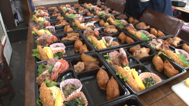 朝6時半。すでに厨房には理佳さんの姿がありました。朝一番に手掛けるのは高齢者の自宅へ届けるお弁当作り。お値段500円前後、配達料は無料。食べる人の好みや栄養バランスなどを考えながら手早く作っていきます。配食は週1回から毎日届ける人までさまざま。さらに大晦日には神社、元日はおせち料理の配達と、365日休まず働いています。
