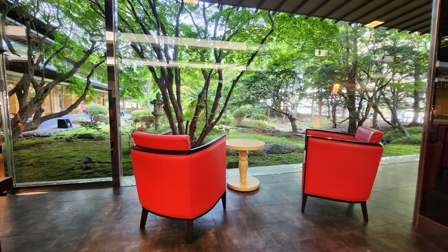 1階売店に併設している「サロン・のぐち文庫」は、庭園を眺めながら趣味の書籍や雑誌、音楽を楽しめる寛ぎのスペースでございます。函館発祥、1932年創業の老舗珈琲店『珈琲焙煎工房 函館美鈴』の挽きたてのコーヒーやココアのフリーサービスもあります。大きな窓からは函館で由緒ある名庭「松岡庭園」を望むことができ、ドリンクとともに優雅なひとときをお過ごしいただけます。