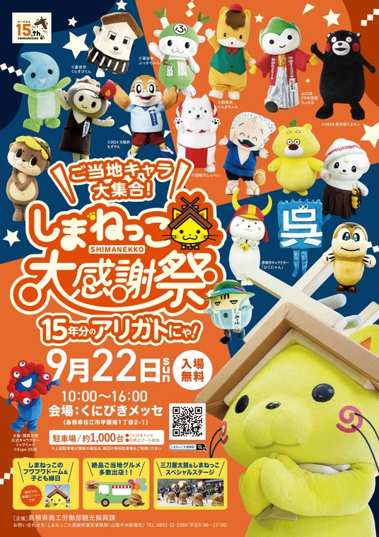 「しまねっこ」は2025年1月で15周年を迎えます。2024年度を記念イヤーと位置づけ、これまで応援していただいている県内外のみなさまやキャラクターへ感謝の気持ちを伝えるべく「しまねっこ大感謝祭~15年分の“アリガト”にゃ!~」を開催します!