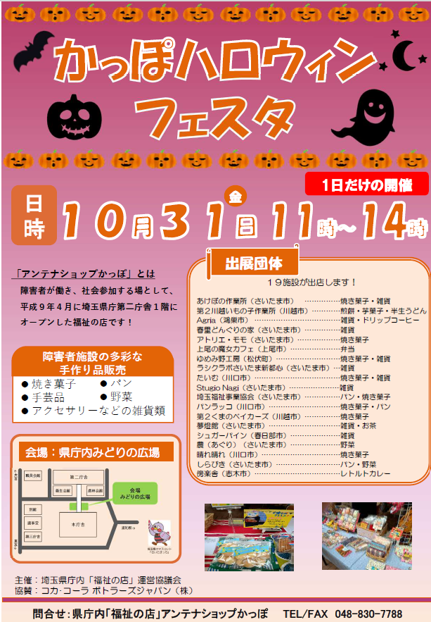 今年も、県庁内福祉の店「かっぽ」が、ハロウィンフェスタを開催します。手作りのパン、お菓子、手芸品などを展示・販売します。今年は19施設が出店予定です。
