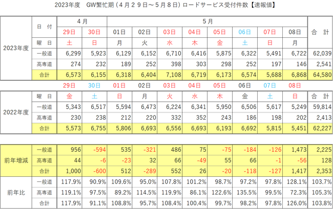 期間中、全国で受け付けたロードサービス件数は6万4580件で、前年同期間の件数と比較し2,353件増加しました。とくに4月29日と5月3日の連休初日は一般道、高速・専用道路(以下、高専道)ともに昨年同日の件数を超過しています。
