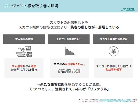 株式会社ガイアックス(本社:東京都千代田区、代表執行役社長:上田 祐司、証券コード:3775)の子会社、株式会社Matka(以下、Matka)は、CPA高騰に悩む人材紹介業界に向け、新たな集客のスタンダードとして「初期接触からのリファラル設計」メソッドを公開いたします。