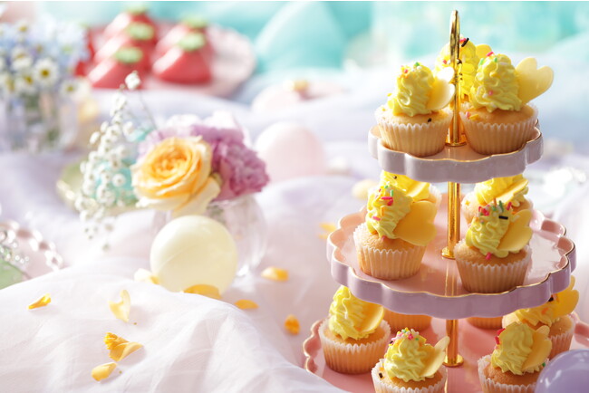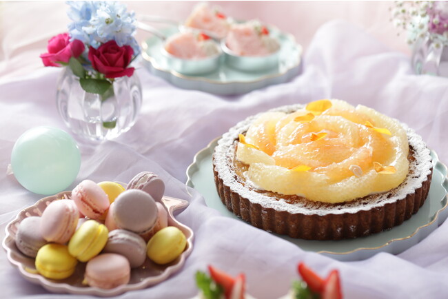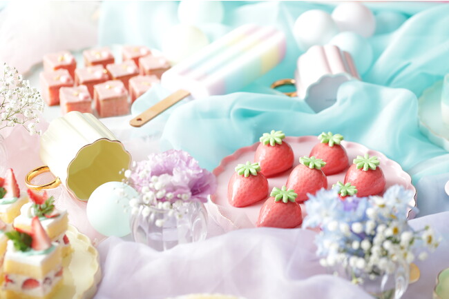 シーズン毎にテーマを変え、結婚式場専属パティシエが創りあげる繊細で華やかなスイーツと、フォトジェニックな空間が大好評のデザートビュッフェ。今回は美しい花々が咲き誇る春の訪れを感じさせる「パステルカラー」をテーマに、いちごをモチーフにしたムースや、可愛らしいパステルロリポップ、チョコミントムース、いちごのシフォンケーキ、カラフルマカロン、オレンジジュレなどのスイーツに加え、春野菜を使用した彩りキッシュやスープ、グリルチキンなどの軽食まで、20種類以上のお料理&スイーツをお好きなだけご堪能いただけます。