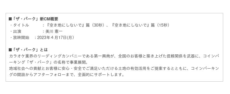 株式会社第一興商(以下、当社)が展開するパーキング事業「ザ・パーク」は、歌手の美川憲一さんを起用した初のTV-CM『空き地にしないで』篇を2023年4月17日(月)より放映します。