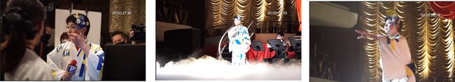 今回の撮影は、スチール撮影からスタート。着物に合わせて青と黄色で仕上げたメイクについて「ここ、(アイシャドウの色)がもう少し濃いほうがいいんじゃない?」と、入念にでき上がりをチェックします。本編撮影スタート後は、普段歌い慣れている歌番組風セットということもあるのか、久しぶりのCM撮影であることを感じさせない落ち着きで、順調に撮影が進みます。