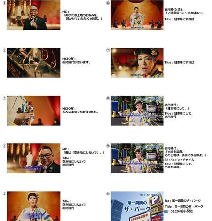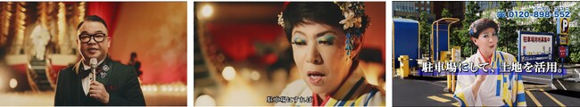 CMの舞台は昭和の歌番組。美川さん演じる演歌歌手“栃尾勝代(とちお かつよ)”は、タキシードに蝶ネクタイ、7:3分けヘアーのMC(西寄ひがし)に呼び込まれ、赤とゴールドの舞台幕から伸びた螺旋階段をゆっくりと下って登場します。「ザ・パーク」のロゴマークにある「P」の文字と青・黄・白の3色の爽やかな印象の着物を身にまとい、架空のCMソング「空き地にしないで」を歌います。「駐車場にすれば~♪」と、歌い上げた後振り返り、「駐車場にして、“土地を活用(栃尾勝代)”」と、なりきっている自身の歌手名と、「ザ・パーク」の運用方法を懸けてのひと言。最後には、駐車場を背景に「その土地は、価値になるのよ」と、空いた土地の活用を後押しします。 * 詳細は次頁をご確認ください。