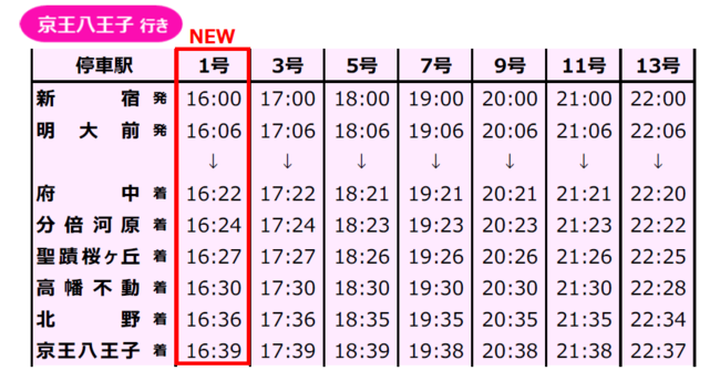 新宿駅を8時台に到着するを京王八王子発、橋本発 各1本ずつ増発します。また、夕夜間においては、新宿発橋本行きの列車を3本増発します。また、一部の列車で各駅の発着時刻を変更しております。