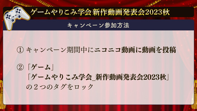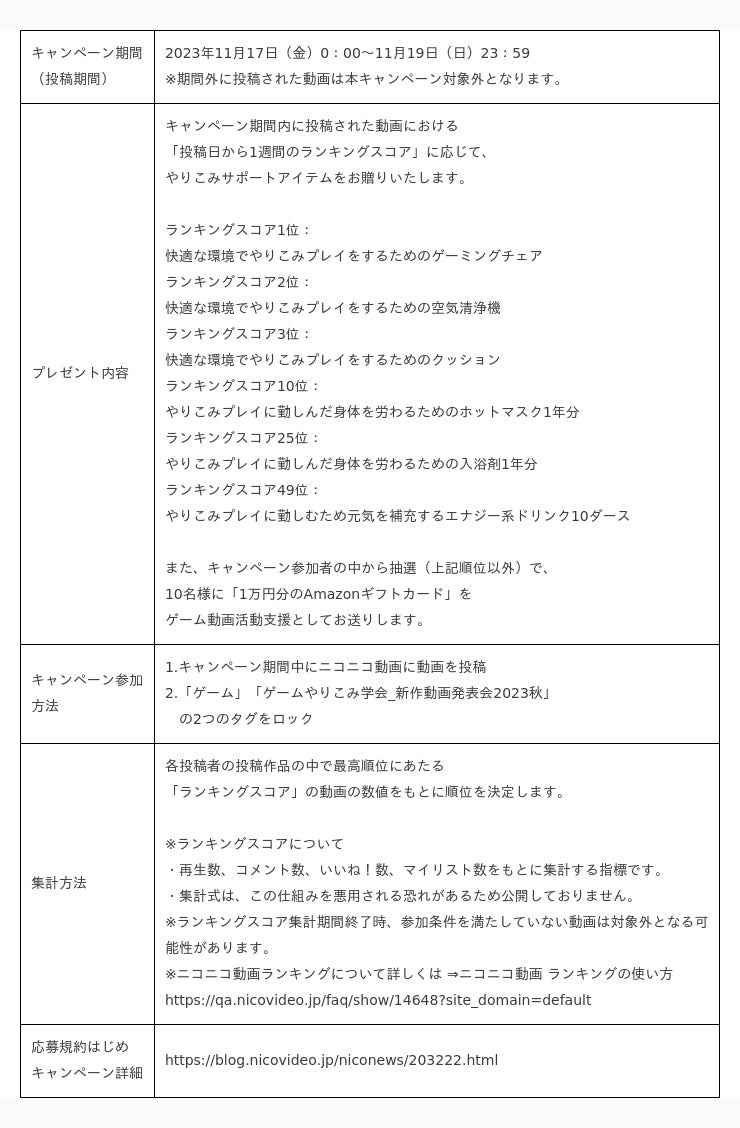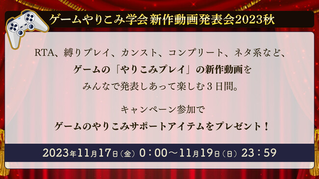 ニコニコでは、RTAや縛りプレイなどゲームの「やりこみプレイ」文化のさらなる発展を目指す祭典として、動画投稿キャンペーン「ゲームやりこみ学会 新作動画発表会2023秋」を開催いたします。