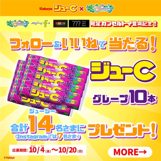 モーリーファンタジー公式Xまたはモーリーファンタジー公式Instagramでは、「ジューC」にかけて10(ジュー)月4(シー)日(金)の14(ジューシー)時より、各アカウントをフォローし、指定ポストをリポストまたはいいねをしていただいた方の中から抽選で各7名さま(合計14名さま)に、「カバヤ ジューCグレープ」10本セットが当たるプレゼントキャンペーンを開催いたします。詳細は各公式アカウントをご確認ください。