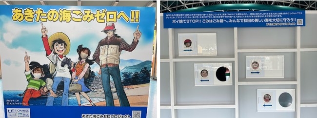 顔出しパネルには、「あきたの海ごみゼロへ!!」の文字が大きく描かれ、釣りキチ三平の人気キャラクターと一緒に写真が撮れるようになっています。