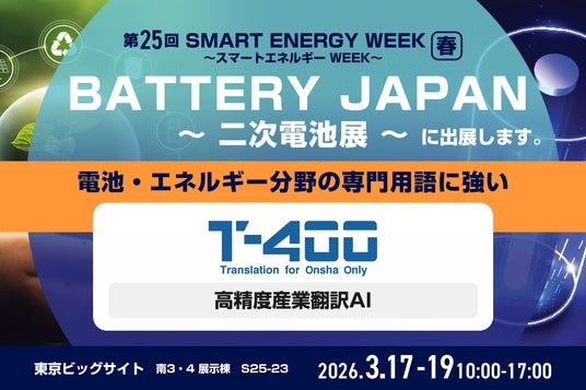 株式会社メタリアルグループで、国内市場No.1※1のAI翻訳サービスを開発・提供する株式会社ロゼッタ(代表取締役:五石 順一)は、電池・エネルギー分野の専門用語に強い高精度産業翻訳AI「T-4OO(ティーフォーオーオー)」について、2026年3月17日(火)~19日(木)に東京ビッグサイトで開催される「第25回 SMART ENERGY WEEK ~スマートエネルギー WEEK~【春】」(BATTERY JAPAN ~ 二次電池展 ~)に出展※2します。