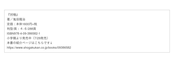 「警察小説大賞」は、そんな時代を動かす書き手を発掘し、原作をマルチメディアな展開につなげていくための新人賞になります。 今年4月に発表された第2回「警察小説大賞」では、鬼田隆治氏の『対極』が同賞を受賞。見事な筆力で、選考委員の相場英雄氏(『震える牛』)と長岡弘樹氏(『教場』)を唖然とさせました。この前代未聞のポリス×ピカレスク小説が、ついに単行本化!