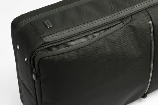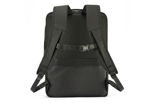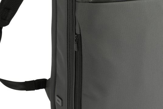 周囲だけでなく着用者にも邪魔になりにくい薄マチ形状ながら、書類やノートPCなどの荷物が効率良く入る無駄のないスクエア型で、容量をしっかり確保しています。
