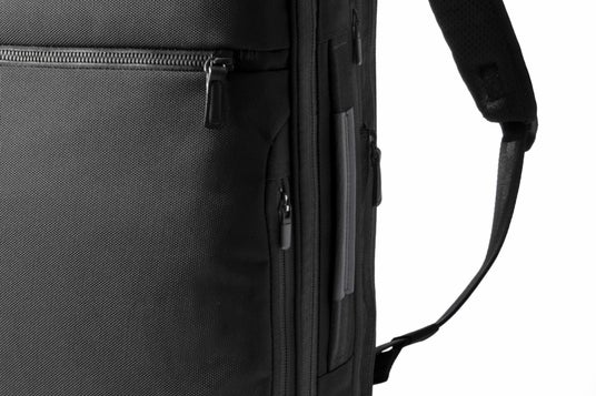 「手に持つ」時はトップハンドル、「棚に上げる」時はサイドハンドルやベルト簡易収納機能、「前に抱える」時は縦・横どちら向きで抱えても取り出しやすい位置にファスナーやポケットを配置しました。