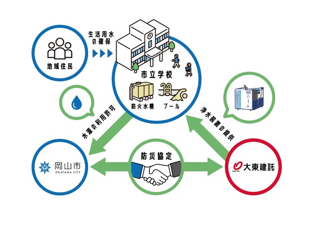 本協定により当社は、災害時など生活用水の確保が困難となった際に、河川やプールから生活用水を製造できる災害対策用の生活用水ろ過装置を提供します。装置は、岡山市が指定する市内の市立学校等に設置し、プールや貯水槽の水を利用可能な状態にしておくことで、地域住民の避難生活に役立てていく予定です。当社は、これまで福岡市、川崎市と生活必需物資を支援する防災連携協定を締結してきましたが、生活用水の支援を行う協定としては岡山市が初となります。