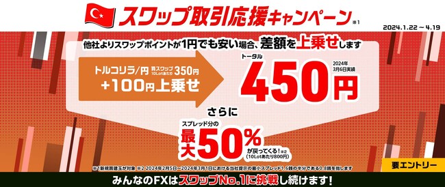 ~トルコリラ/円、南アフリカランド/円、メキシコペソ/円の高金利3通貨ペアのスワップポイントが他社より1円でも安い場合、差額を上乗せ!さらにスプレッド分の最大50%をキャッシュバック!~