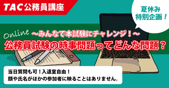 公務員、日商簿記検定、税理士、公認会計士などの資格取得に向けた教育サービスを展開しているTAC株式会社(東京都千代田区、代表取締役社長:多田敏男)は、8/23(火)に『公務員試験の時事問題ってどんな問題!?~みんなで本試験にチャレンジ~』をオンラインセミナーで開催します。多くの公務員試験で出題される時事問題を知っておくだけで、日々のニュースの見方がおおきく変わるはず!オンラインセミナーではTACで長年時事問題の科目を担当しているベテラン講師が、公務員試験に出題された問題をクイズ形式で出題していきます。一足早く、実際の本試験レベルの問題を体感できるので、公務員に興味ある方や、受験予定の方は必見です!セミナーはオンラインで開催しますが、事前質問や当日Q&Aも受け付けます。顔や氏名が他の参加者へ映ることはありませんので安心してご参加ください。